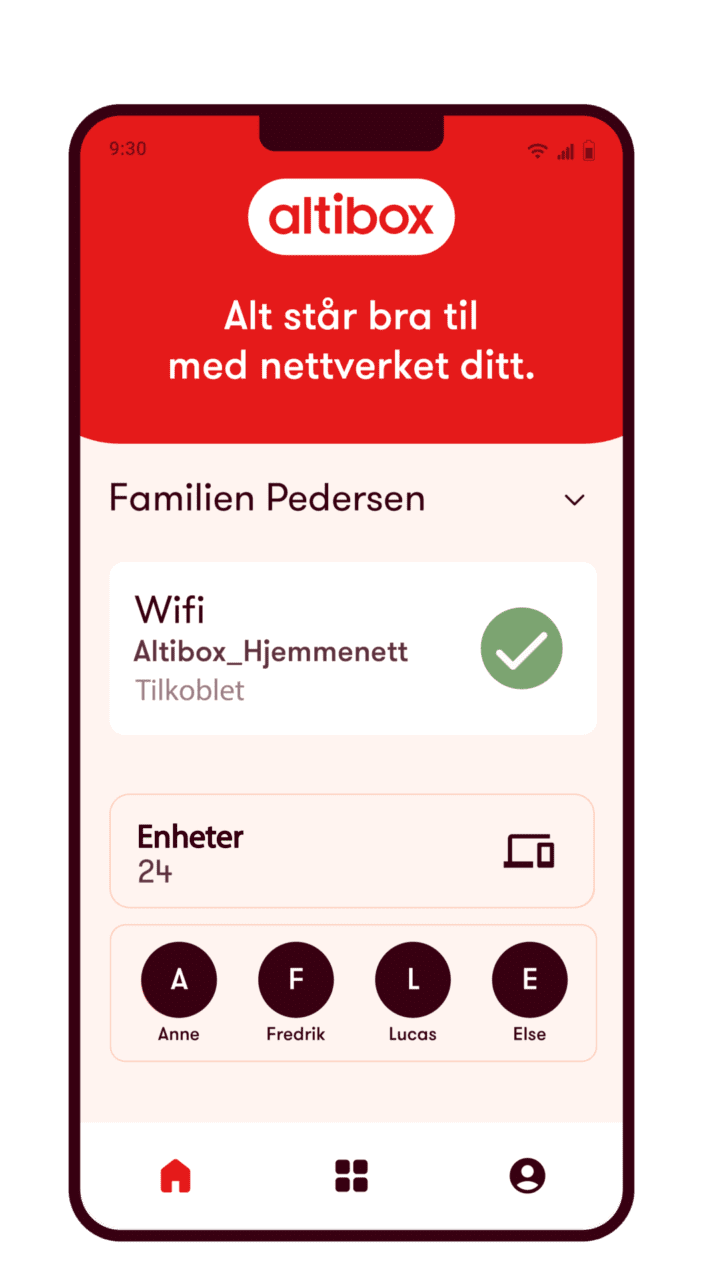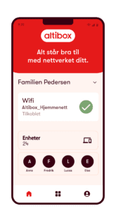 Med appen Altibox Hjem får du enkel oversikt over mesh-nettet ditt, både hjemme og på farta. Du kan raskt sette opp, følge med og styre Altibox Wifi Overalt-punktene dine, og se signalstyrken i sanntid. Foreldrekontroll er nå tilgjengelig, og varsler kommer i løpet av året.